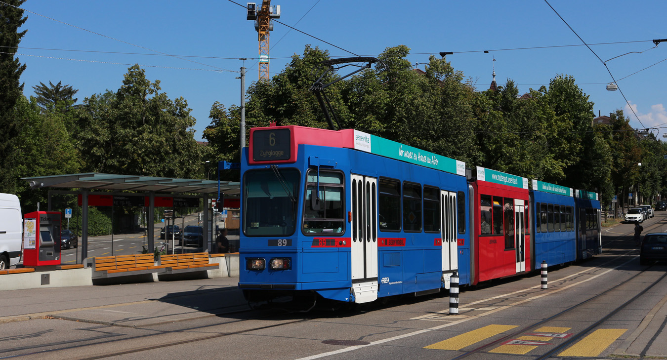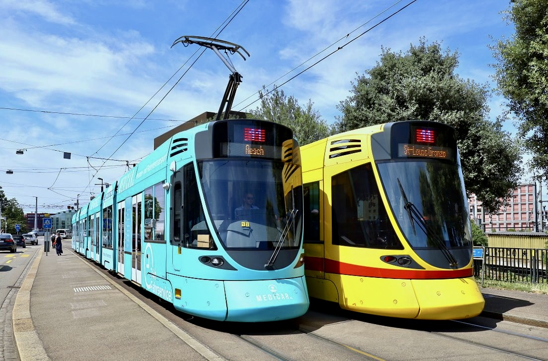Doppeltraktion, mit dem Be 4/4 501, dem B4S 1492 und dem Be 4/4 478, auf der Linie 6, bedient am 05.07.2024 die Haltestelle Kirche in Allschwil.