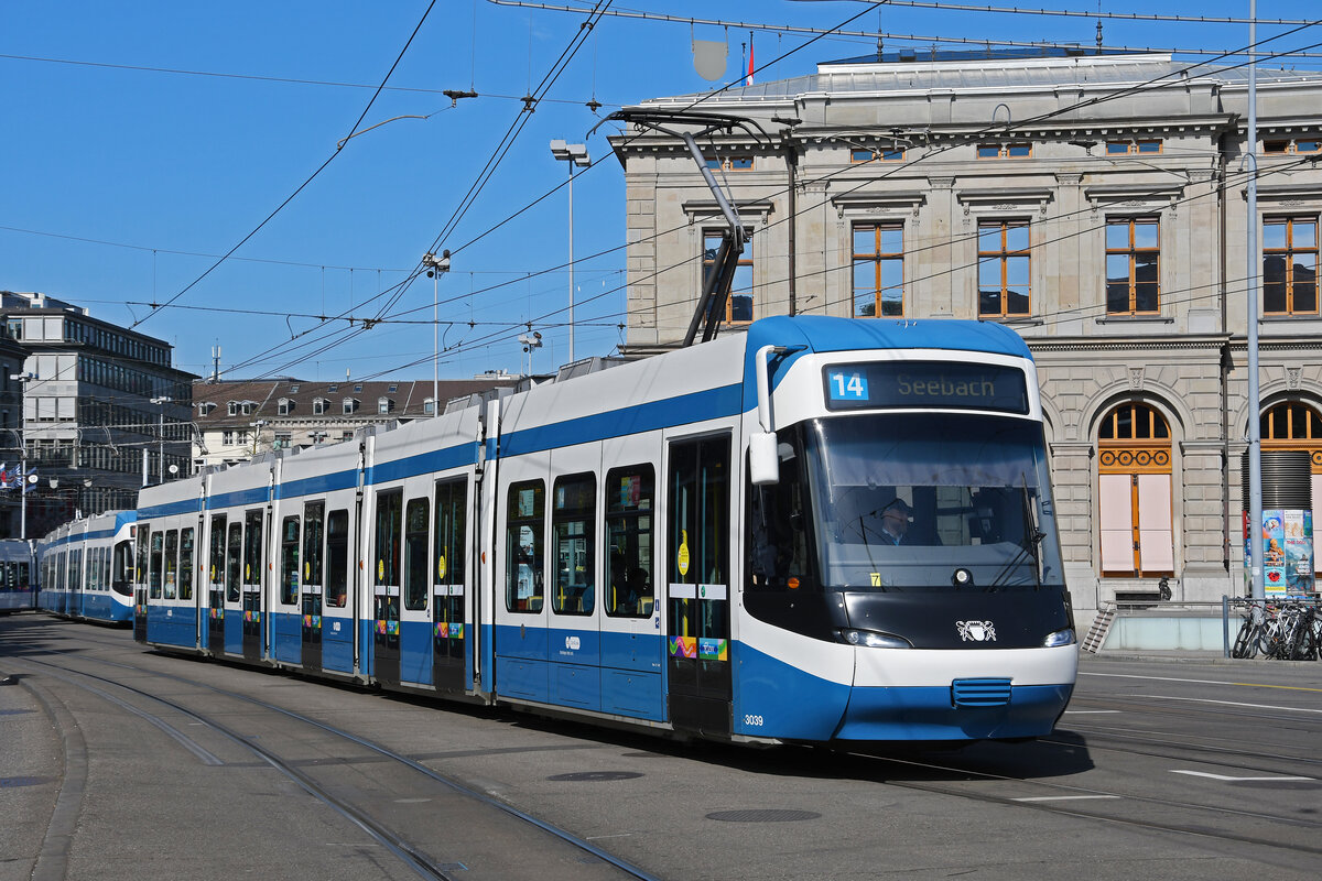 Be 5/6 Cobra 3039, auf der Linie 14, fährt am 12.04.2024 zur Haltestelle beim Bahnhof Zürich.