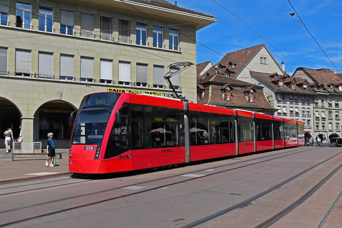 Be 6/8 Combino 659, auf der Linie 8, bedient am 09.07.2024 die Haltestelle Zytglogge beim Casinoplatz. Aufnahme Bern.