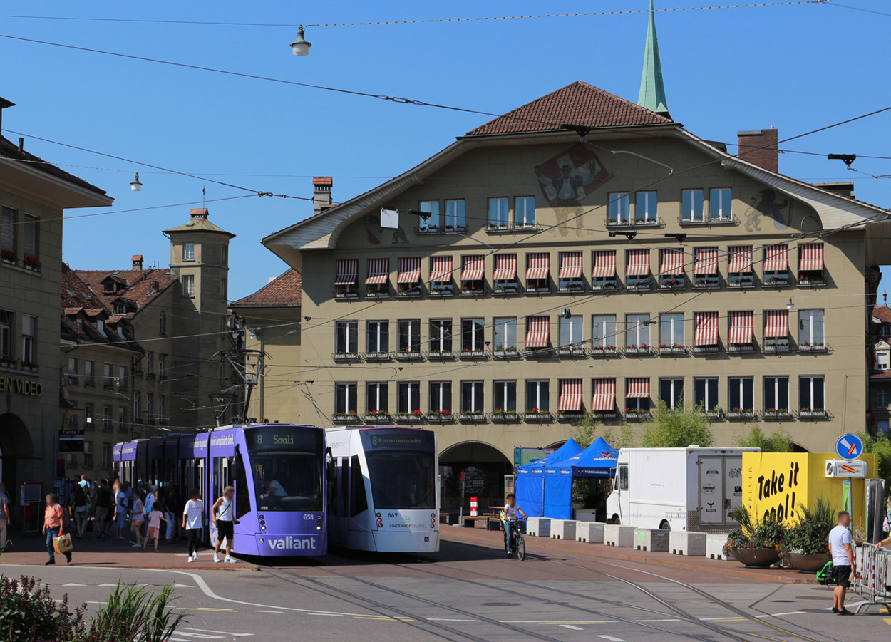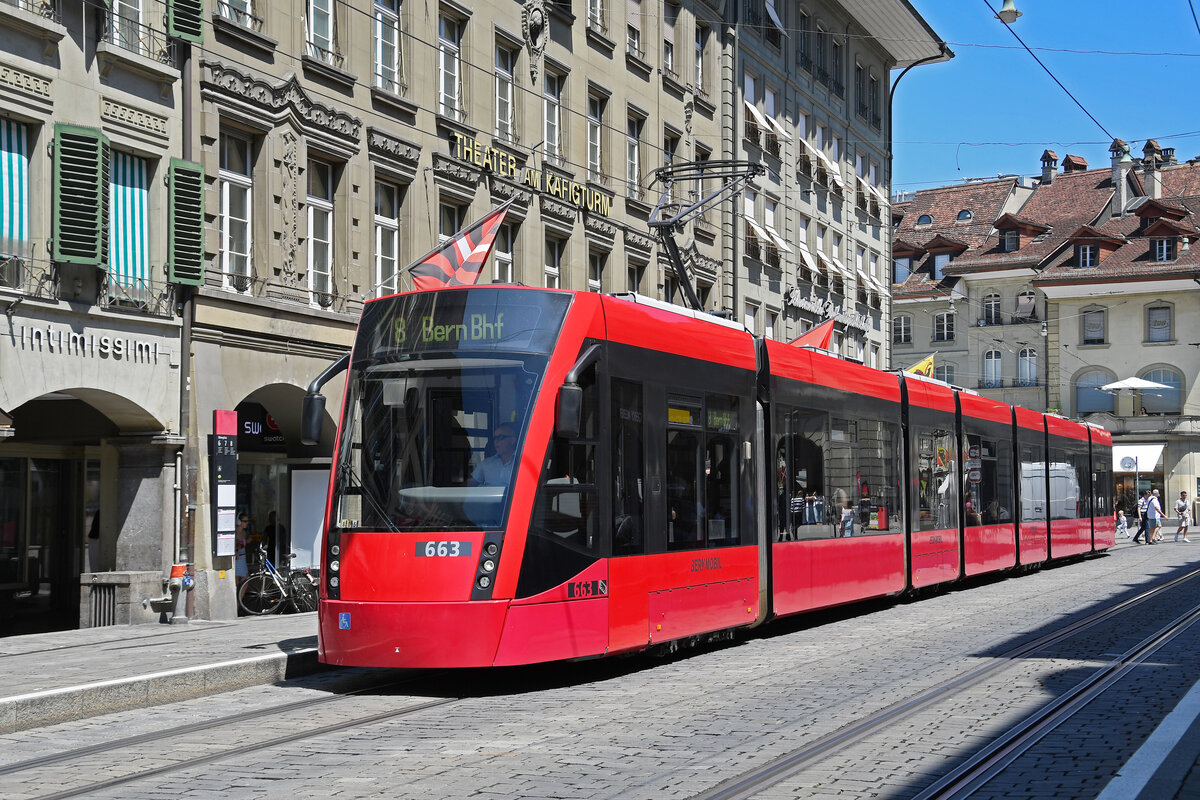 Be 6/8 Combino 663, auf der Linie 8, bedient am 09.07.2024 die Haltestelle Bärenplatz. Aufnahme Bern.