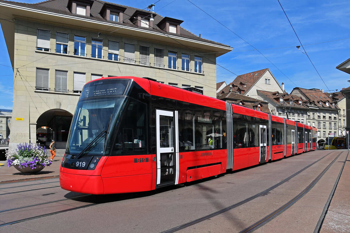 Be 6/8 Tramlink 919, auf der Linie 7, fährt am 09.07.2024 zur Haltestelle Zytglogge beim Casinoplatz. Aufnahme Bern.