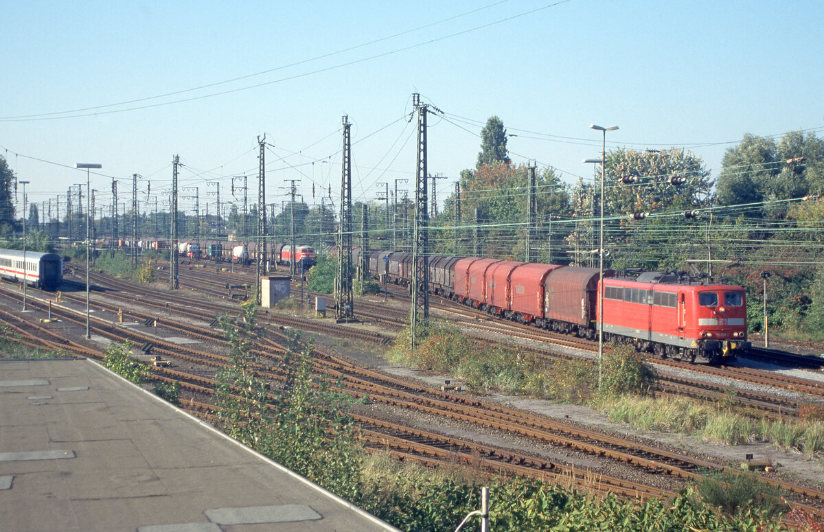 Blick auf den Bahnhof Emmerich. DB 151 095 verlässt den Bf mit Zug 45121 (Beverwijk H - Hagen Vorhalle). 15.10.2003. Scanbild 8816, Fujichrome100.