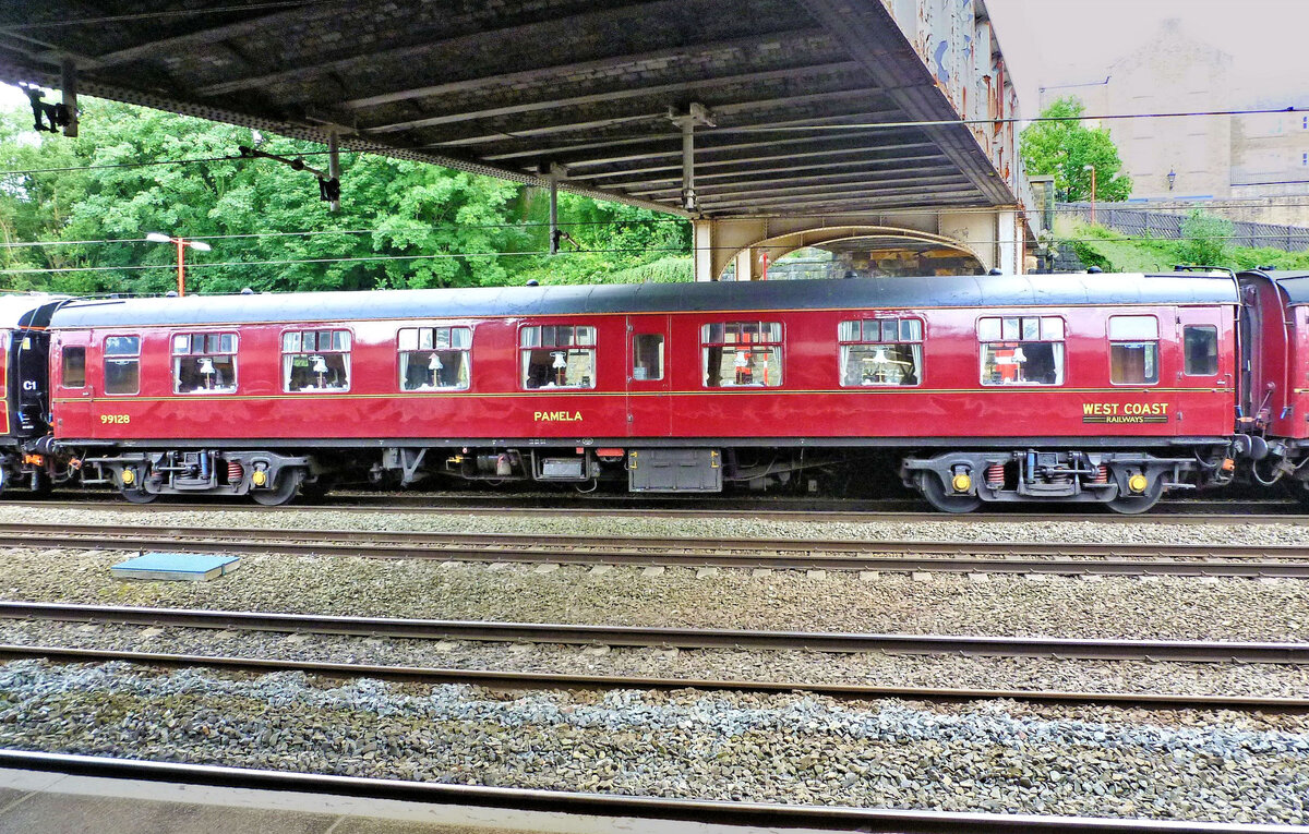 Britische Personenwagen: Die zum Standard gewordene kastanienrote Farbe am Erstklasswagen 99128 (gebaut 1963) der West Coast Railways. Die West Coast Railways mit Sitz in Carnforth ist eine der grössten Betreiber von Sonderzügen und Sonderfahrten in Grossbritannien. Lancaster, 11.Juli 2012