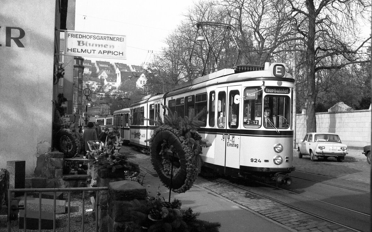 SSB Stuttgart__DoT4 923 mit B2 ("Schiffle") als E-Wagen biegt beim Pragfriedhof aus der Friedhofstr. in die Heilbronner Str. ein.__06-11-1976