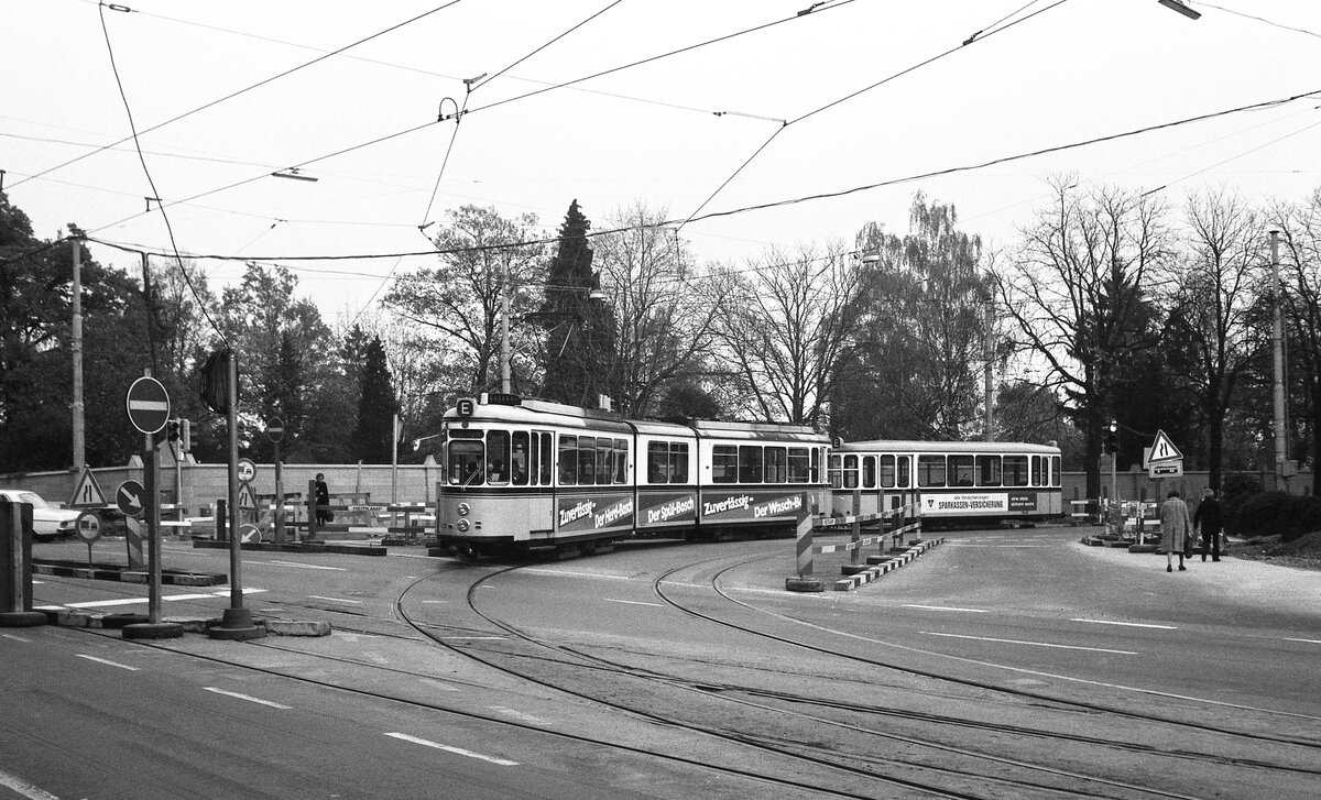 SSB Stuttgart__DoT4 mit B2 ("Schiffle") als E-Wagen fährt am Pragsattel in Richtung Feuerbach.__06-11-1976