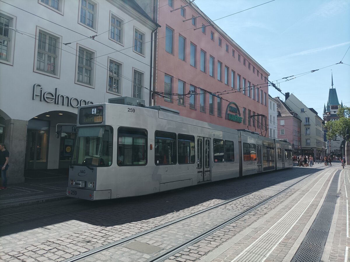 VAG Freiburg Düwag GT8Z Nr 259 auf der Linie 4 Zum Zähringer am Berthold Brunnen am 6.8.2024
