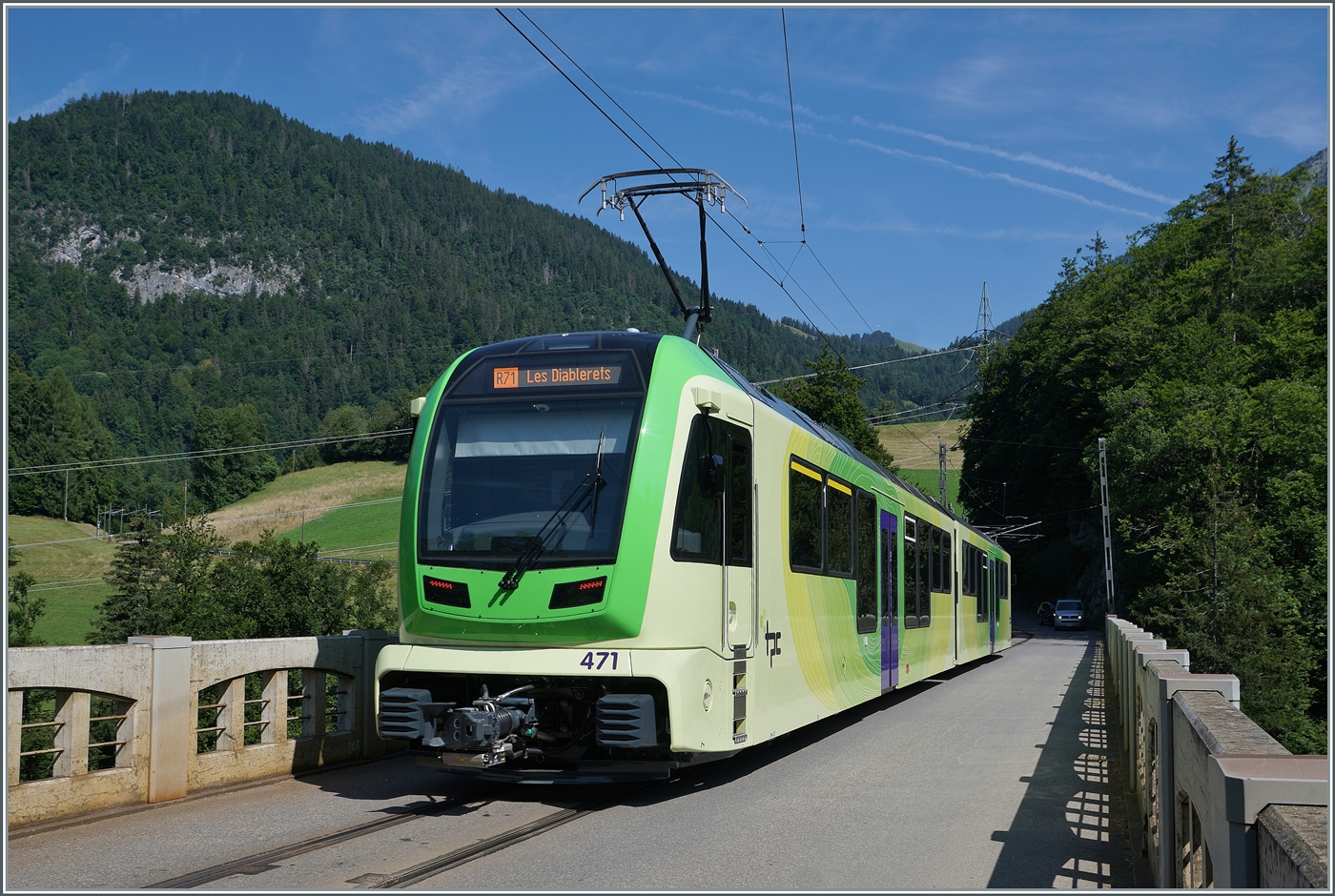 Der ehemalige montafoner Triebwagen ET 10.108 (94 81 4480 108-1) absolvierte Mitte Juli 2024 Probefahrten im neuen Design von DBP entlang der Südbahn. (Aufnahmeort zwischen Frohnleiten und Mixnitz).