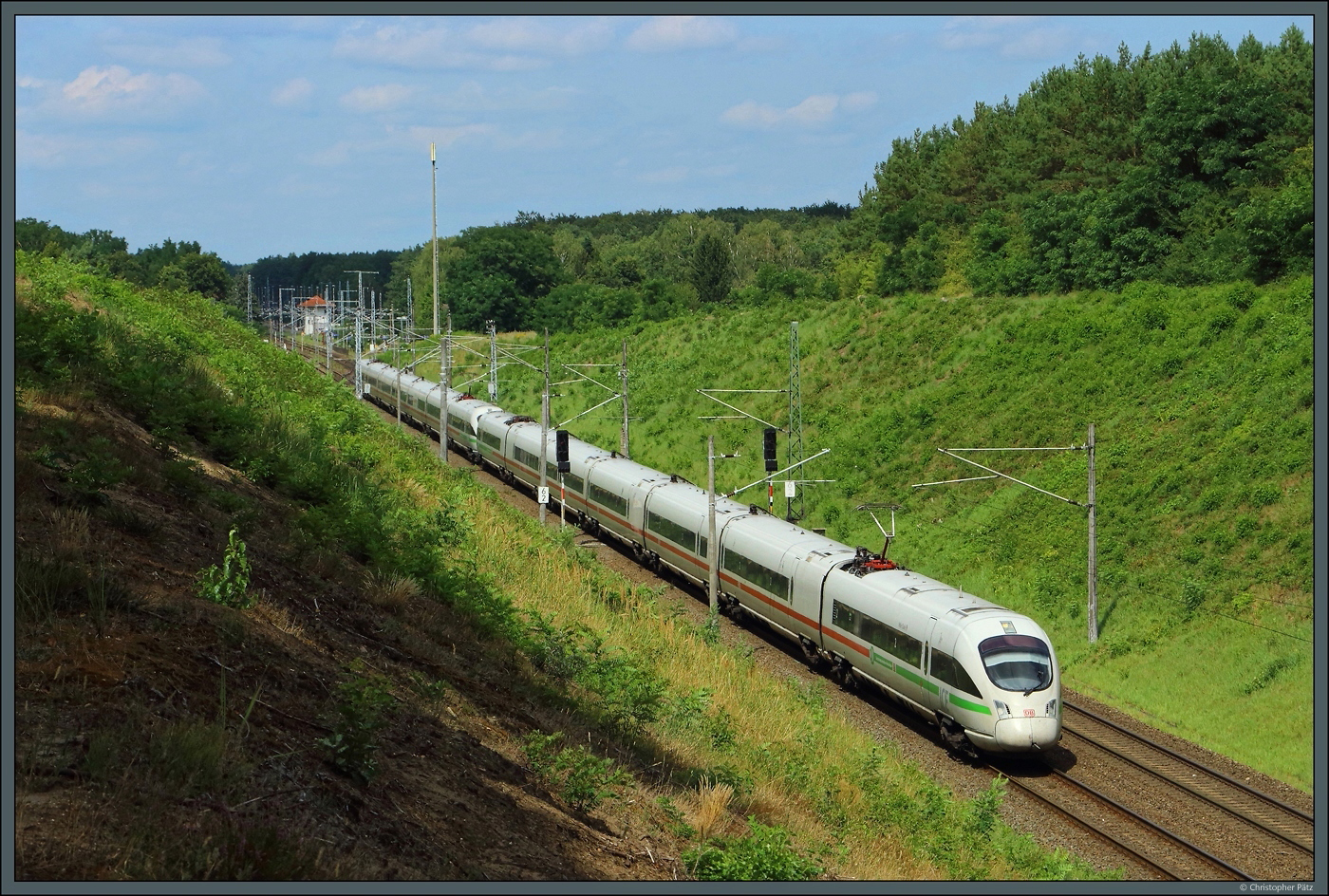 Südlich des Bahnhofs Medewitz verläuft die Strecke nach Roßlau in einem Einschnitt. Hier, an den Einfahrsignalen des Bahnhofs Medewitz, rollt 411 073 am 03.08.2024 mit einem weiteren 411er Richtung Süden.