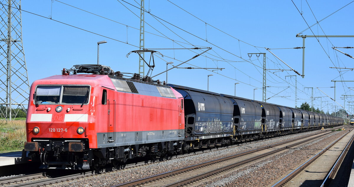 Bahnlogistik24 GmbH, Dresden mit ihrer "120 127-6" (NVR: "91 80 6120 127-6 D-BLC") und einem Getreidezug am 06.08.24 Durchfahrt Bahnhof Rodleben.