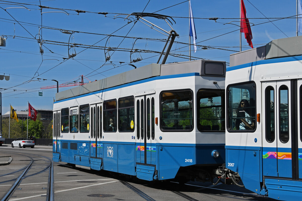 Be 2/4 2418, auf der Linie 9, fährt am 12.04.2024 als Zweitwagen bei der Haltestelle Bellevue ein. Aufnahme Zürich.