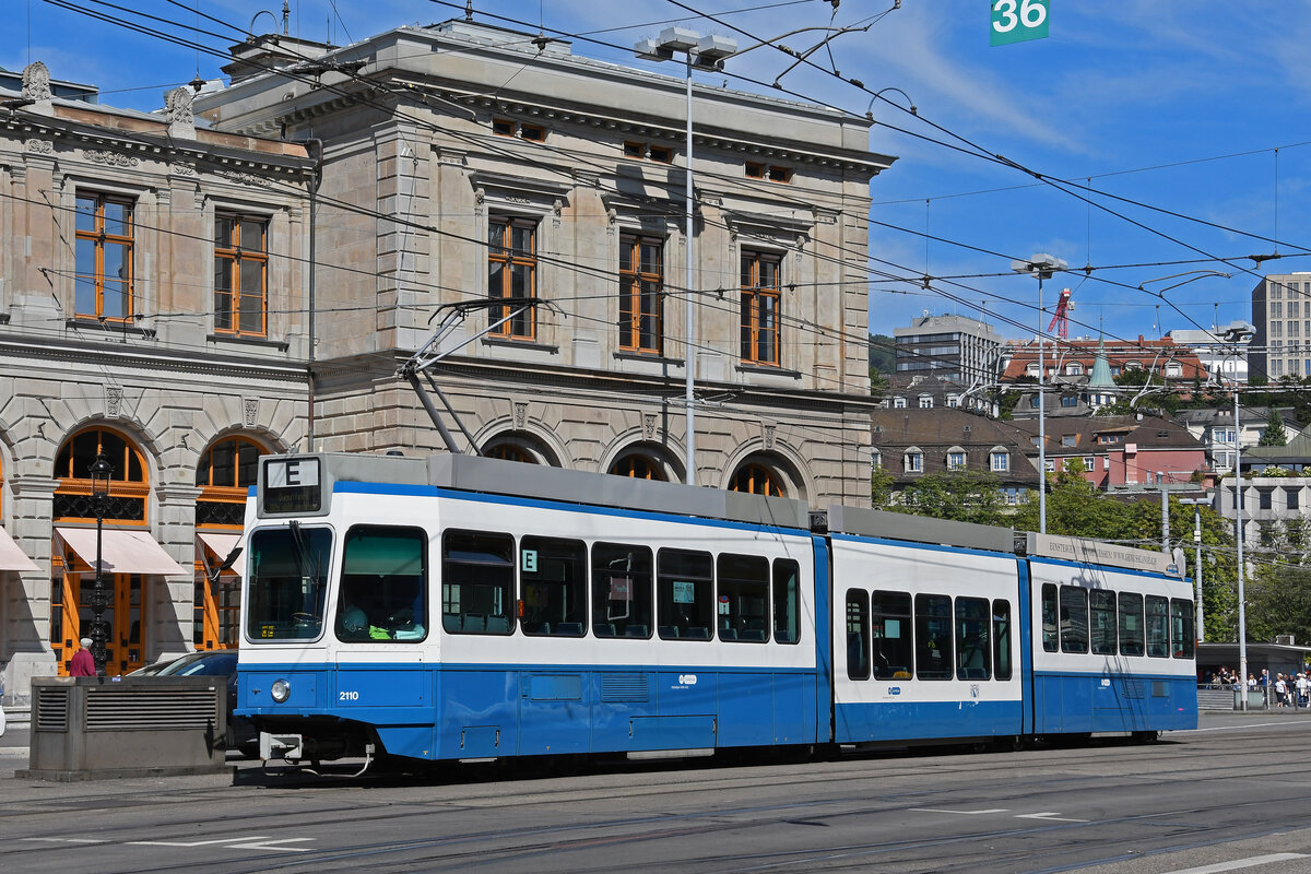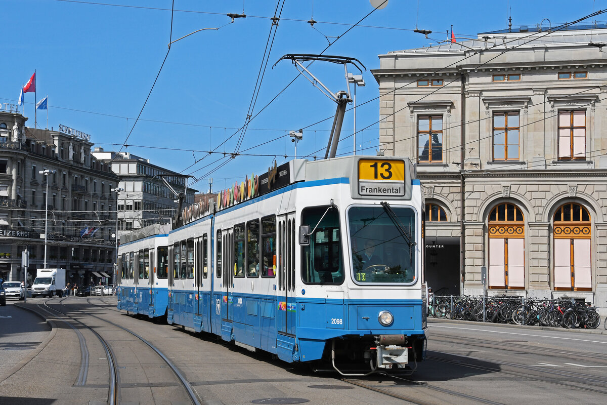 Doppeltraktion, mit dem Be 4/6 2098 und dem Be 2/4 2404, auf der Linie 13, fährt am 22.08.2024 zur Haltestelle beim Bahnhof Zürich.