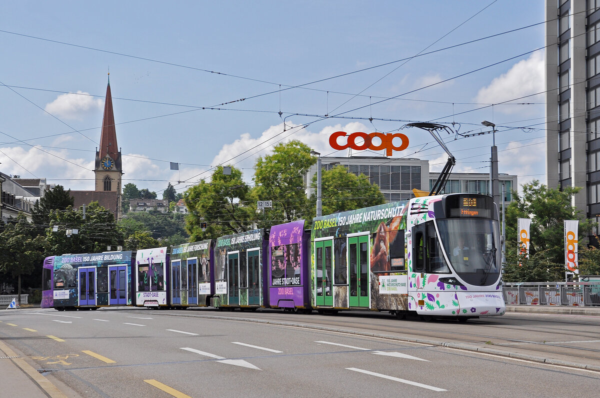 Be 6/8 Flexity 5028 mit der Werbung für die Fussball EM der Frauen 2025 in der Schweiz, auf der Linie 6, bedient am 05.07.2024 die Haltestelle Gewerbeschule. Aufnahme Basel.