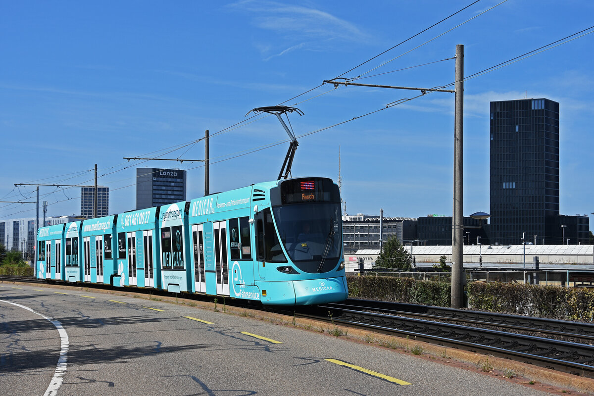 Be 6/10 Tango 164 mit der Medicar AG Werbung für Personen und Patienten Transport, auf der Linie 10, fährt am 23.08.2024 zur Haltestelle M-Parc. Aufnahme Basel.