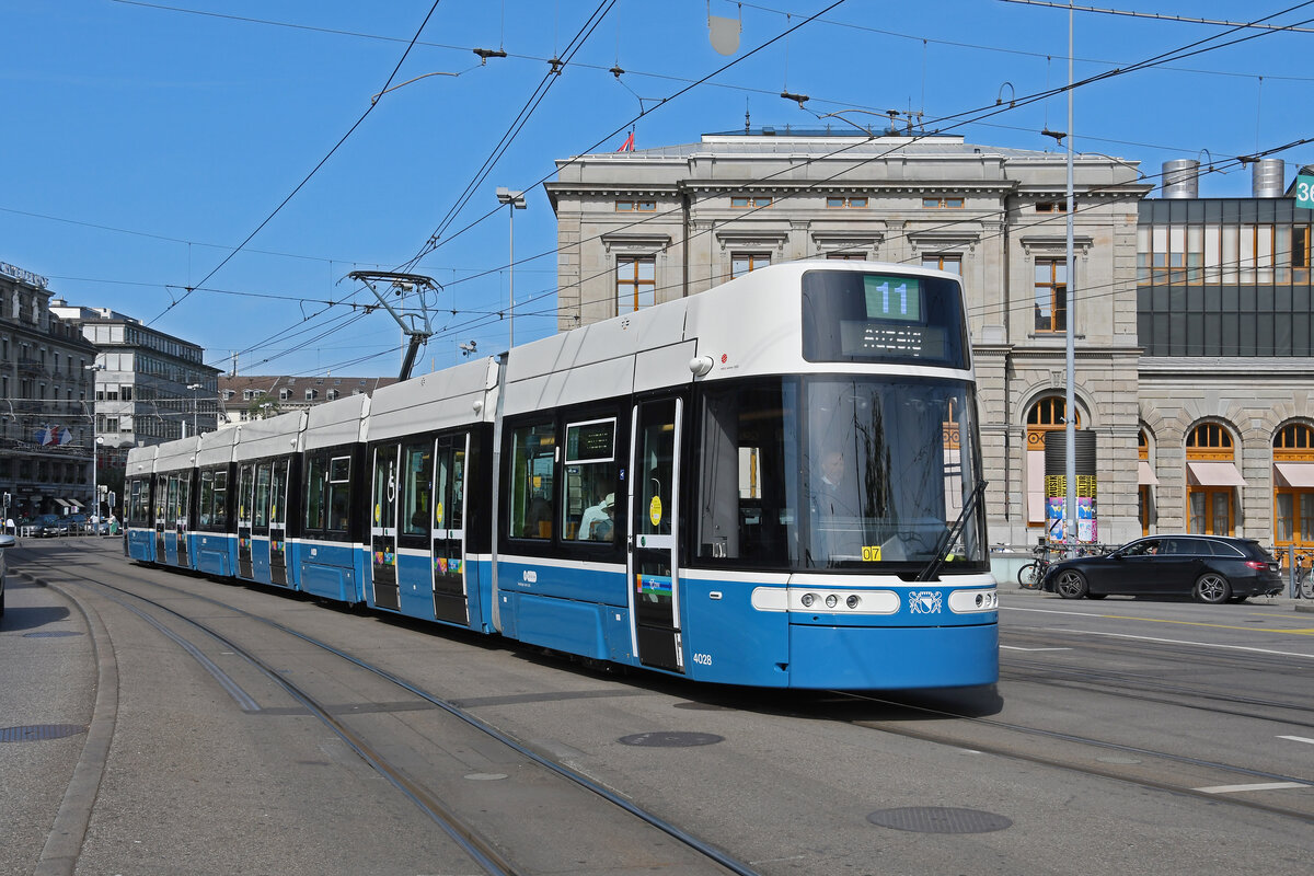 Be 6/8 Flexity 4028, auf der Linie 11, fährt am 22.08.2024 zur Haltestelle beim Bahnhof Zürich.