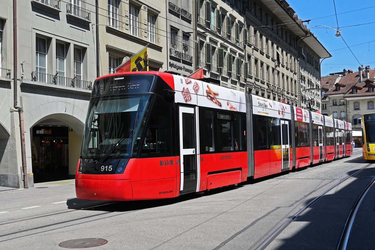 Be 6/8 Tramlink 915, auf der Linie 7, bedient am 09.07.2024 die Haltestelle Bärenplatz. Aufnahme Bern.