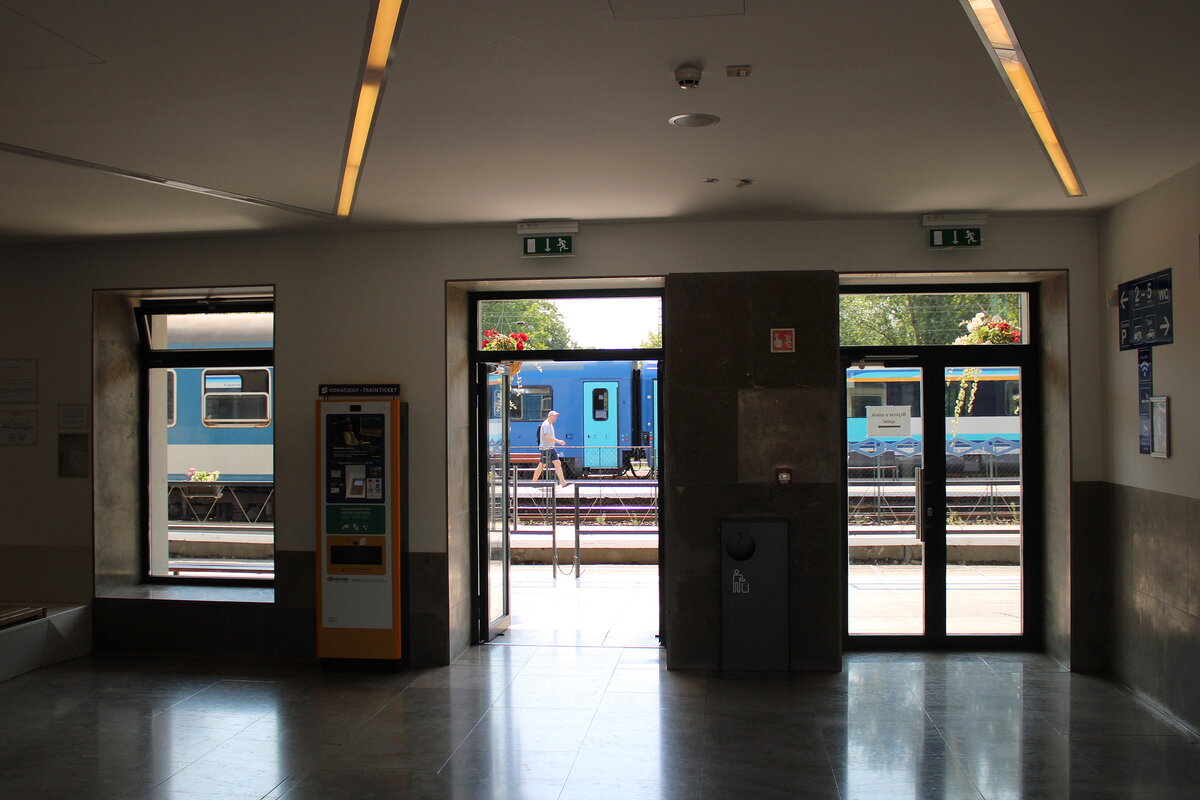 Blick am 19.07.2024 aus dem Warteraum in Keszthely auf die Bahnsteige und Züge nach Tapolca und Budapest Déli.