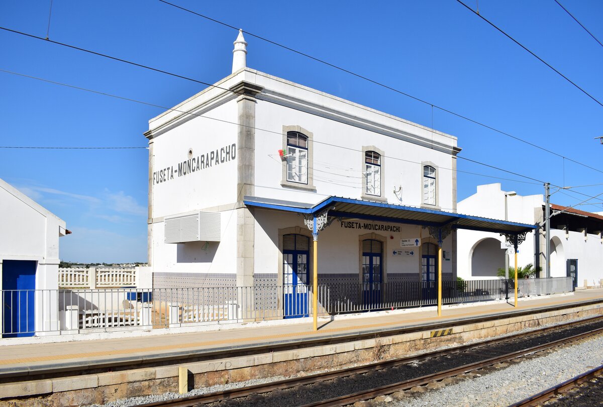 Blick auf das Empfangsgebäude in Fuseta. Ehemals Fuseta-Moncarapacho. Das Gebäude wurde vermutlich mit dem Bau der Algarve Linie 1904 in Betrieb genommen. Heute steht das Empfangsgebäude leer macht aber dennoch einen äußerlich gepflegten Eindruck.