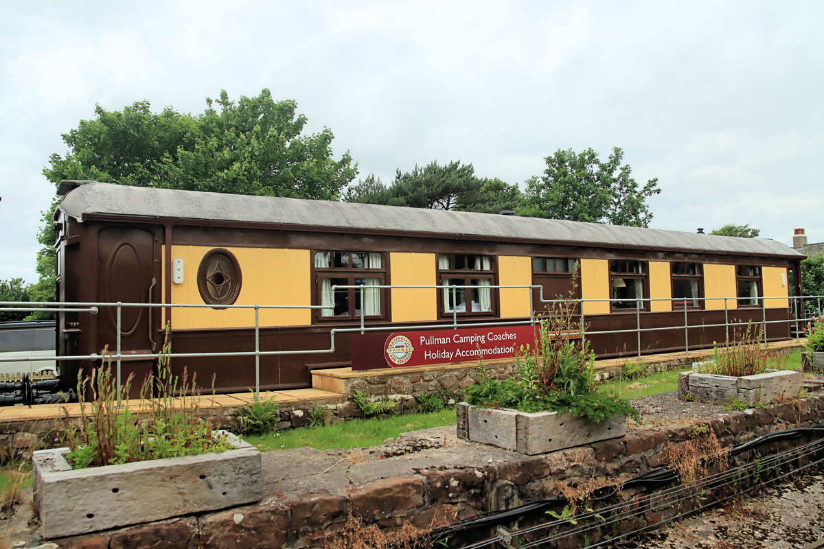Britische Personenwagen - Pullman-Wagen: hier steht ein wunderschön restaurierter sogenannter "Camping Coach" Pullman-Wagen in Ravenglass, im Nordwesten Englands. Der Wagen mit dem Namen "Maid of Kent" entstand 1917 für einen Ambulanzzug und wurde, zusammen mit sehr vielen weiteren, in den 1930er Jahren zum Camping Coach. Damit ermöglichte die Bahn einer grossen Zahl von Gästen Urlaub entlang einer Bahnlinie, doch die Betriebeinstellung eines grossen Teils von Stich- und Nebenlinien in Grossbritannien sowie die Aufhebung von Abstellgleisen in den 1960er Jahren bedeutete das Ende dieser Camping Coaches um 1971. Die "Maid of Kent" gelangte offenbar 1959 nach Ravenglass und ist heute im Besitz der Ravenglass & Eskdale Privatbahn. 13.Juni 2024