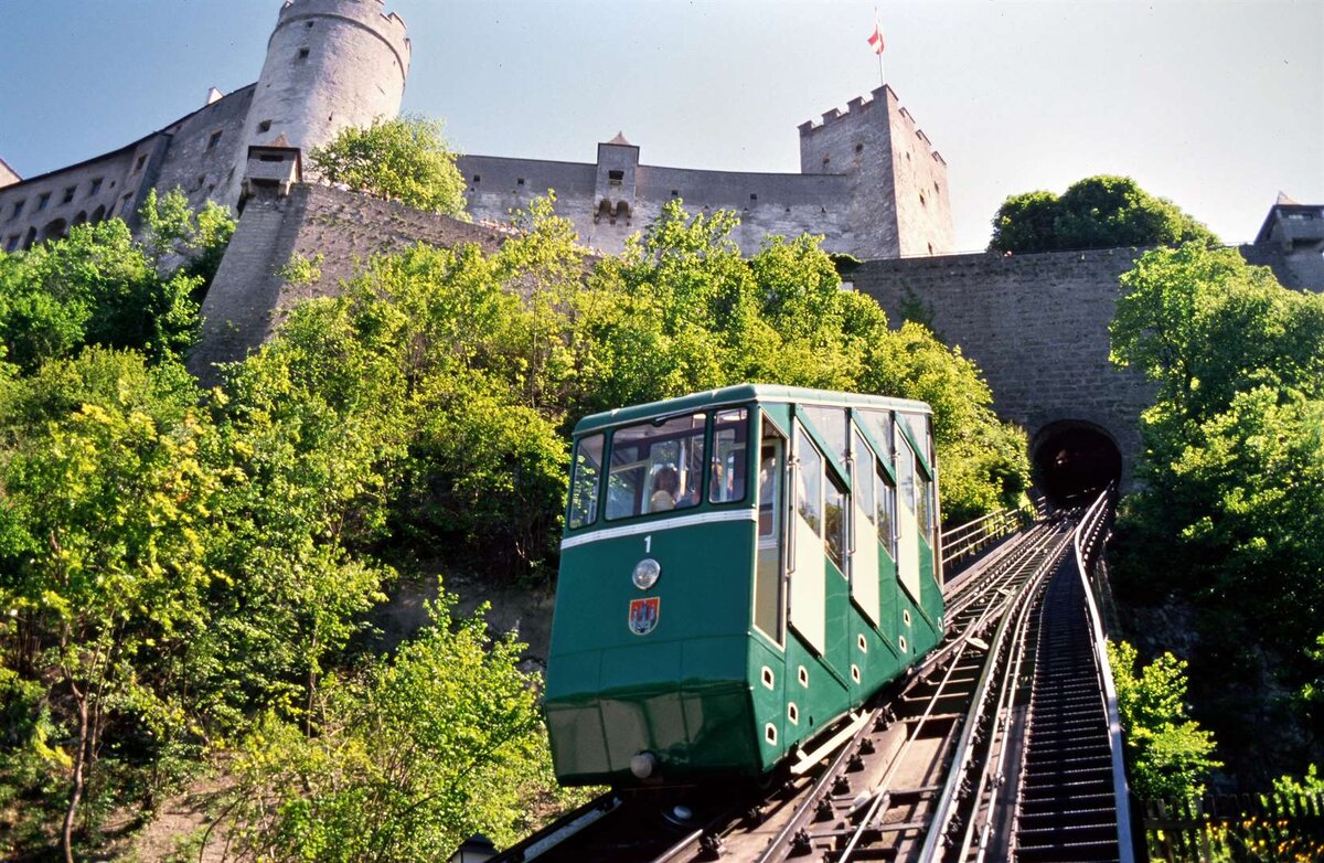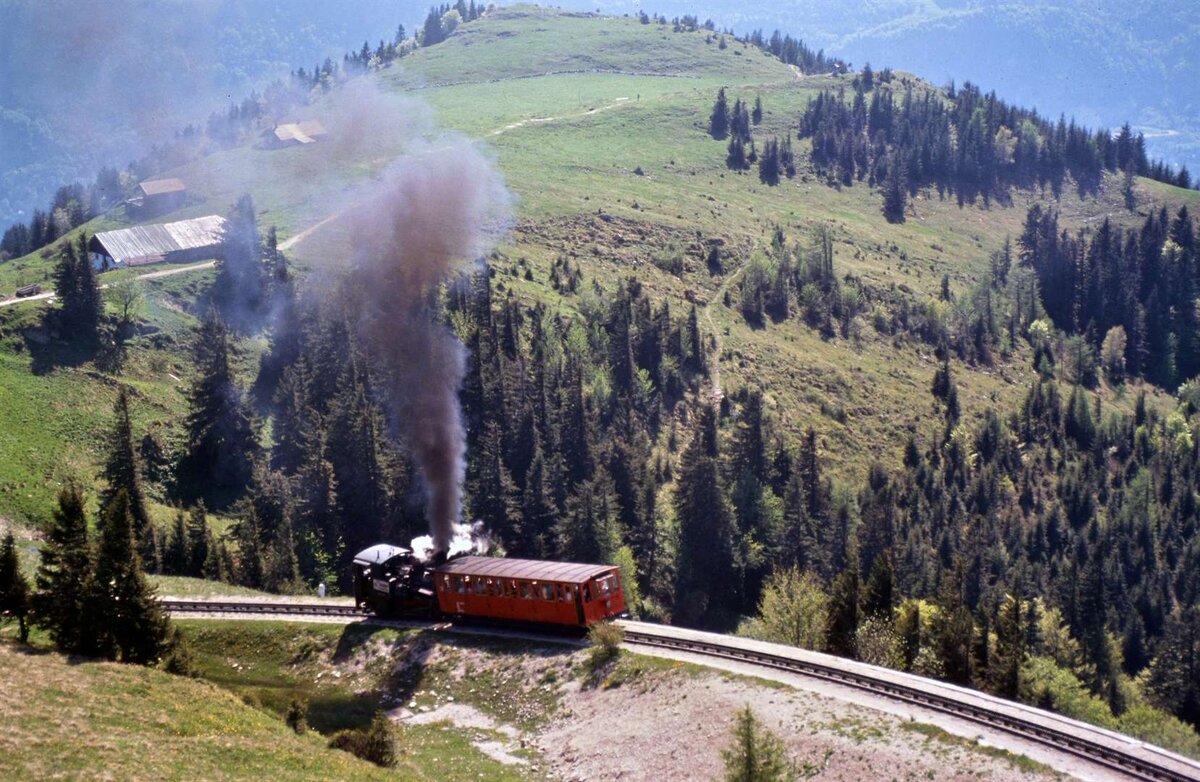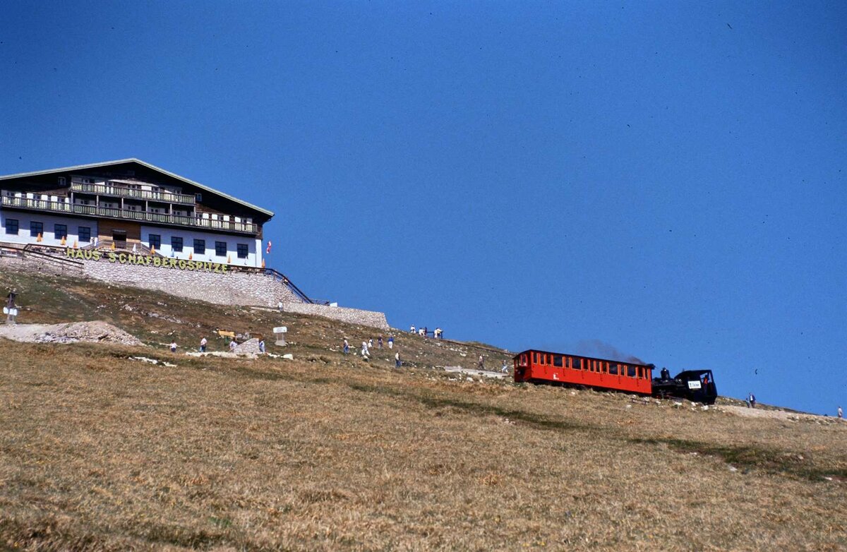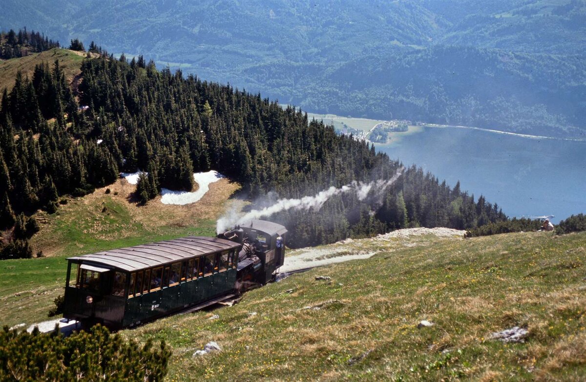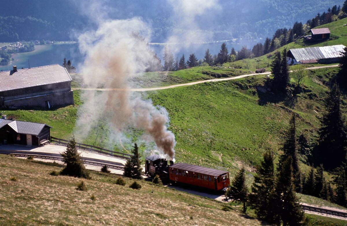 Ein Zug der Schafbergbahn dampft zur Bergstation (1986)
