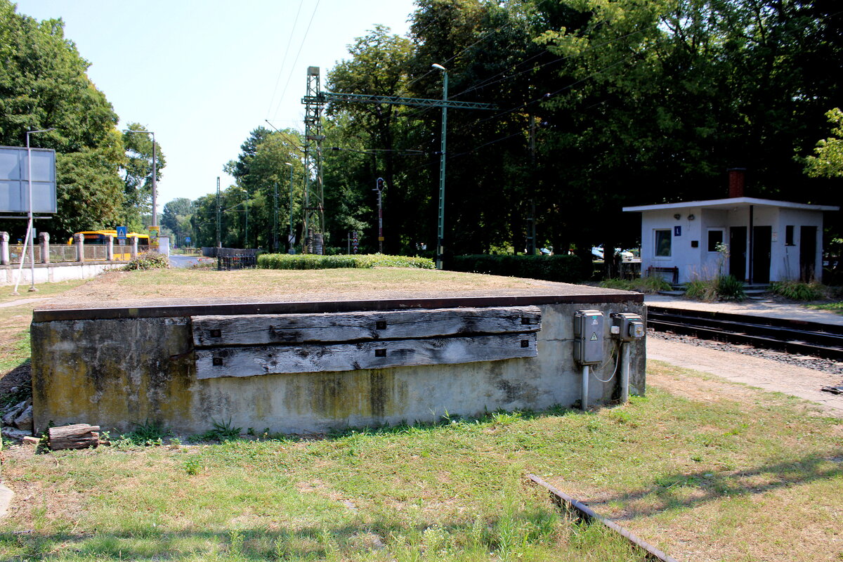 Abstellgleis mit Prellbock für die Bzmot-Triebwagen, am 19.07.2024 in Keszthely. Vom Bahnsteig aus fotografiert.