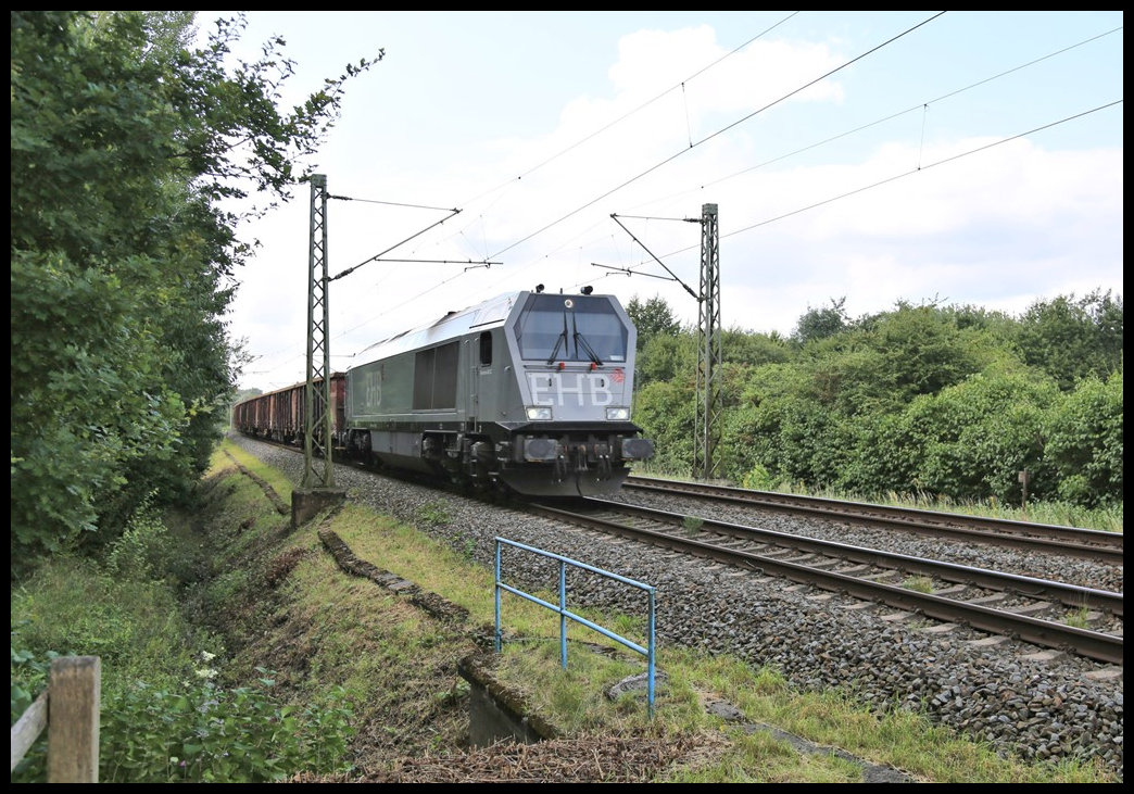 Havelländische Eisenbahn AG, Berlin-Spandau (HVLE) mit dem Tiger "V330.5" (NVR: "92 80 1250 008-0 D-HVLE") und einem Ganzzug VTG Selbstentladewagen am 05.08.24 Durchfahrt Bahnhof Cottbus Hbf.