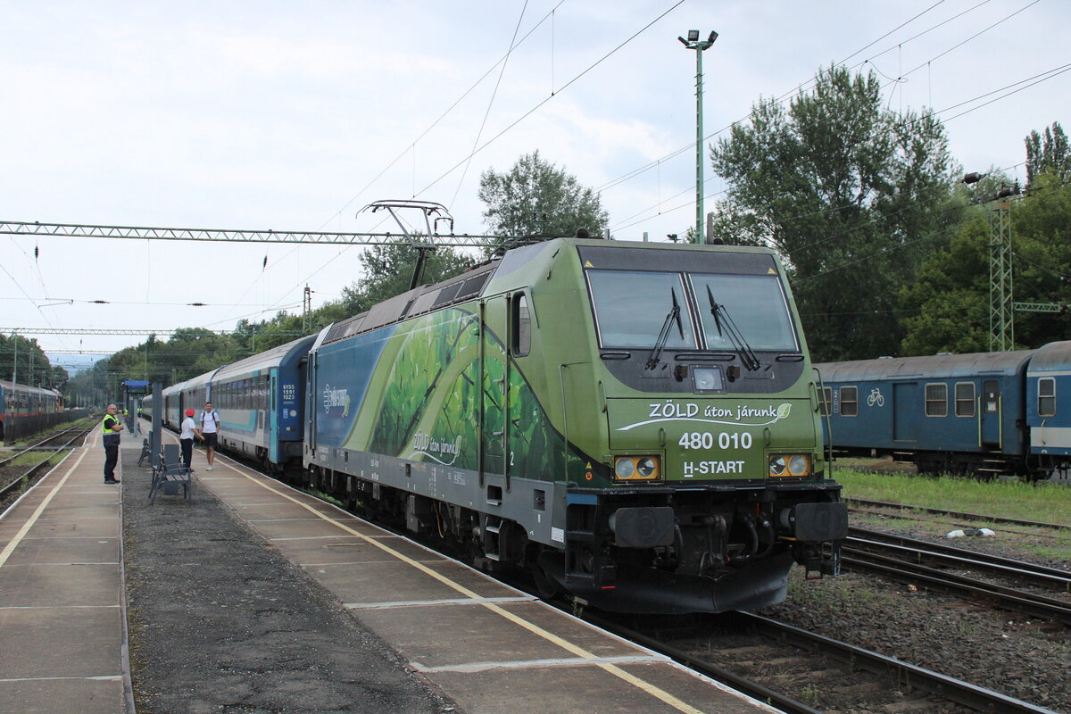 MÁV H-START 480 010 "Zöld Úton Járunk" setzt am 20.07.2024 in Keszthely nach dem umfahren der Wagen an den IC 873 "Balaton", um ihn zurück nach Budapest Déli zubringen.