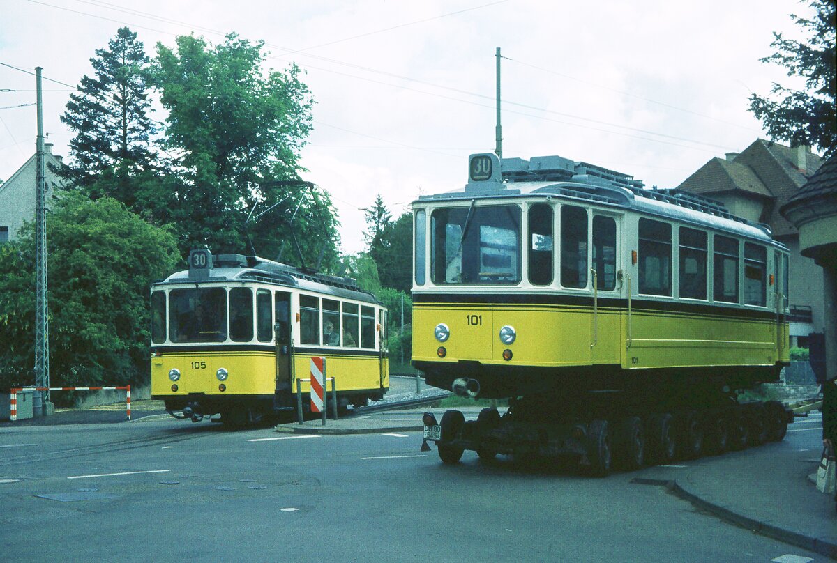 SSB Stuttgart__Zahnradbahn__Der bereits 1973/74 modernisierte Tw 105 im Linienverkehr trifft den frisch modernisierten Tw 101, noch auf dem Straßenroller, in der Jahnstr. in Degerloch. __30-05-1975
