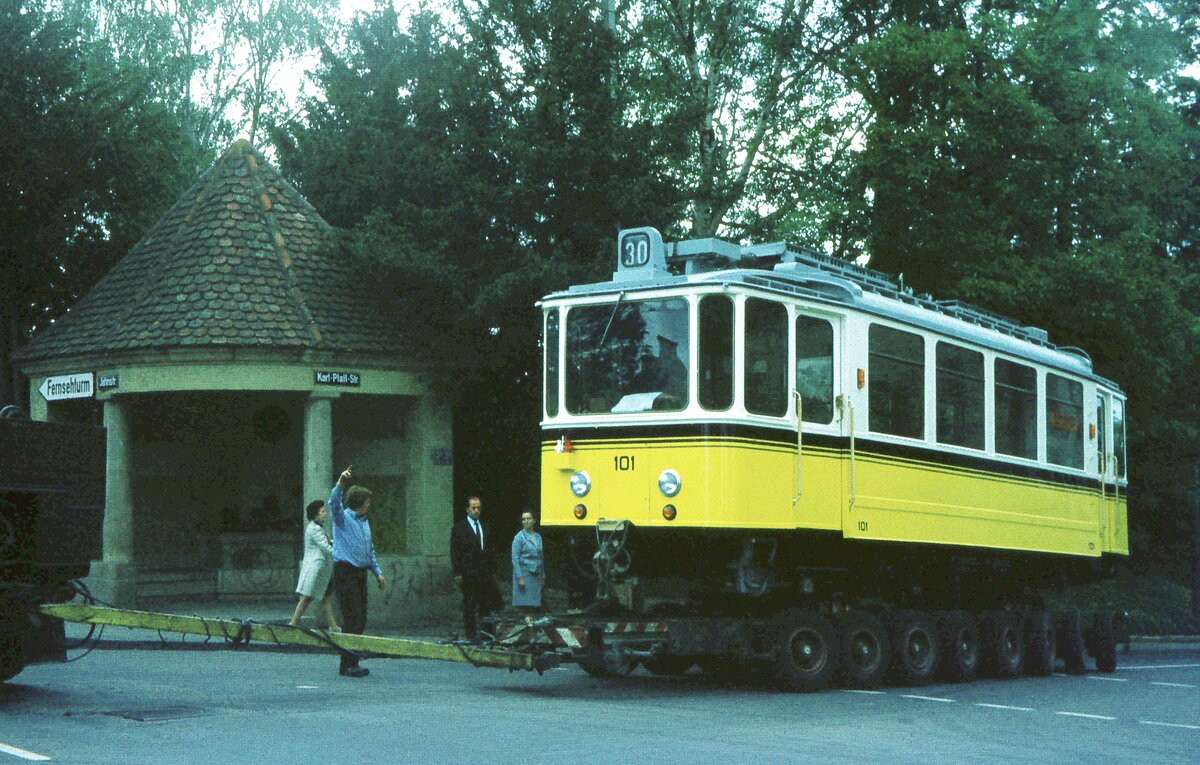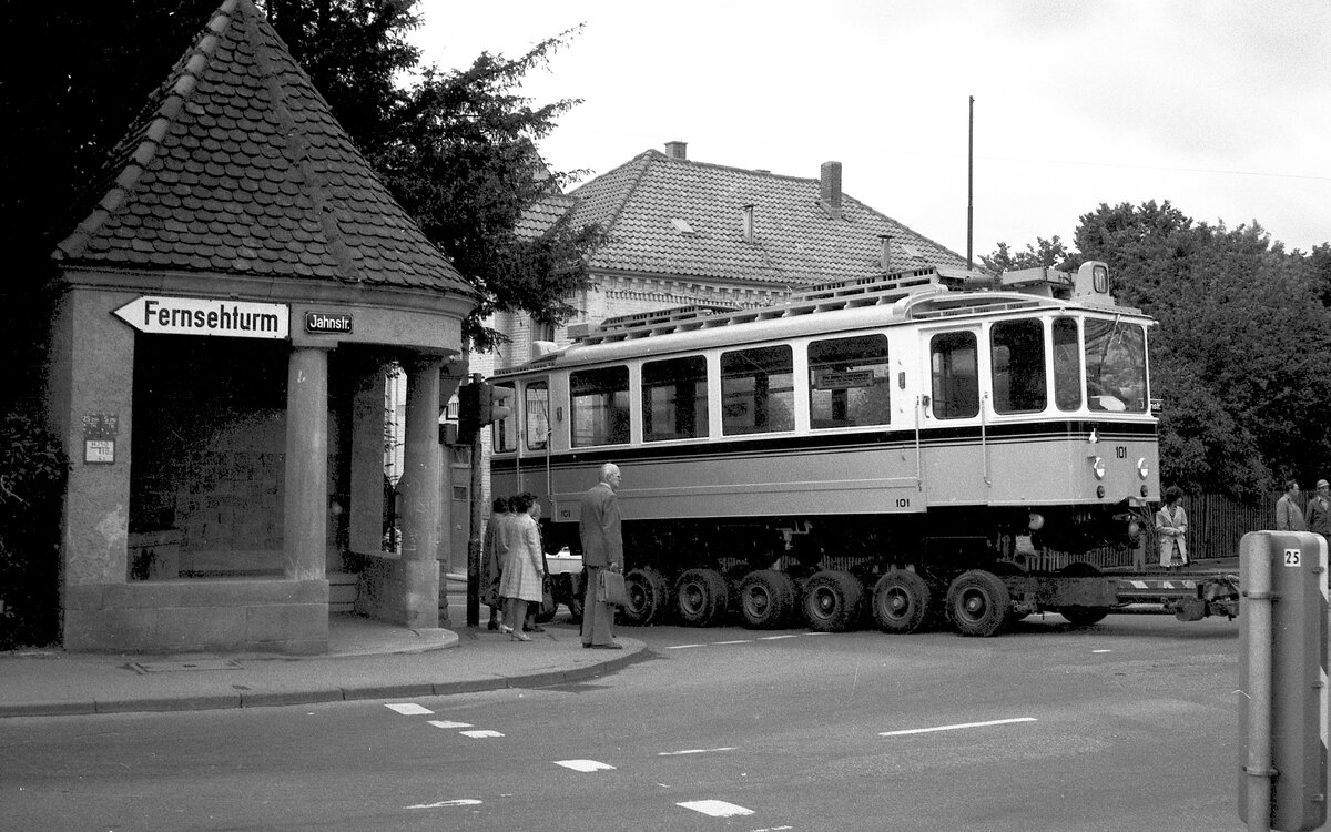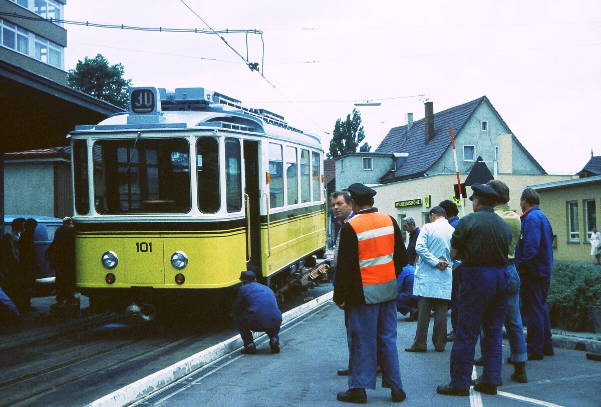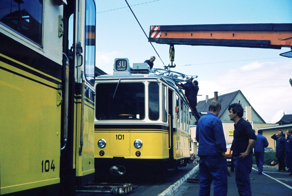 SSB Stuttgart__Zahnradbahn__Als käme er bereits von der Nägelestr. auf dem Gleis angefahren. Aber ohne Stromabnehmer ? Noch steht der 101er auf dem Straßenroller in der Jahnstr.__30-05-1975