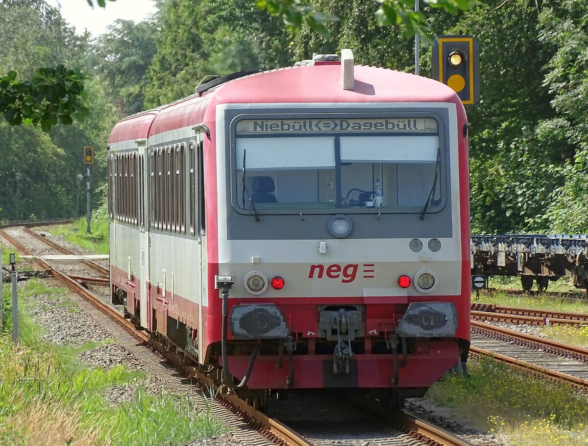 VT71 (628 071/629 071) der NEG am 05.07.24 bei der Ausfahrt aus Niebüll Richtung Dagebüll.