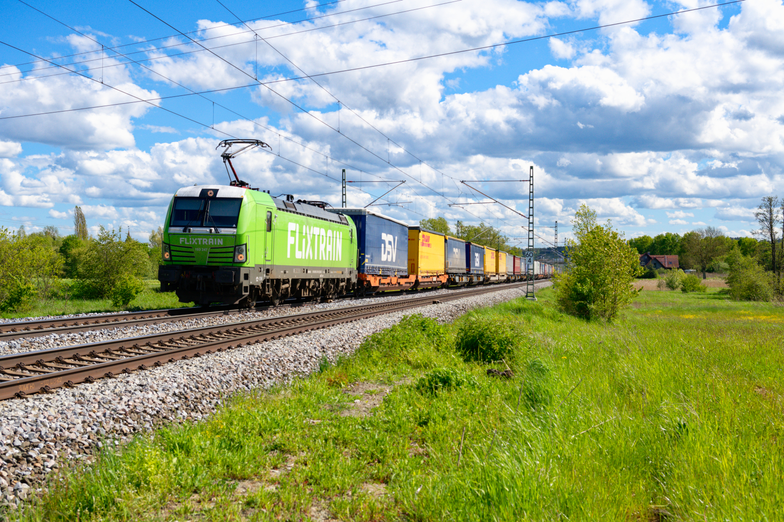 193 247 ELL/TXL "Flixtrain" mit einem KLV-Zug bei Lehrberg Richtung Würzburg, 22.05.2021
