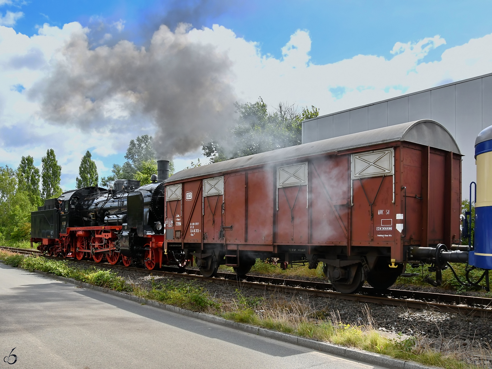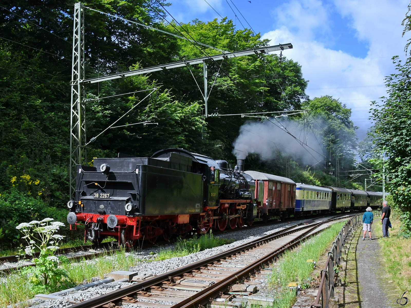 Die Dampflokomotive 38 2267 wurde hier Anfang Juli 2024 während der Fahrt Tender voraus in Hattingen abgelichtet.