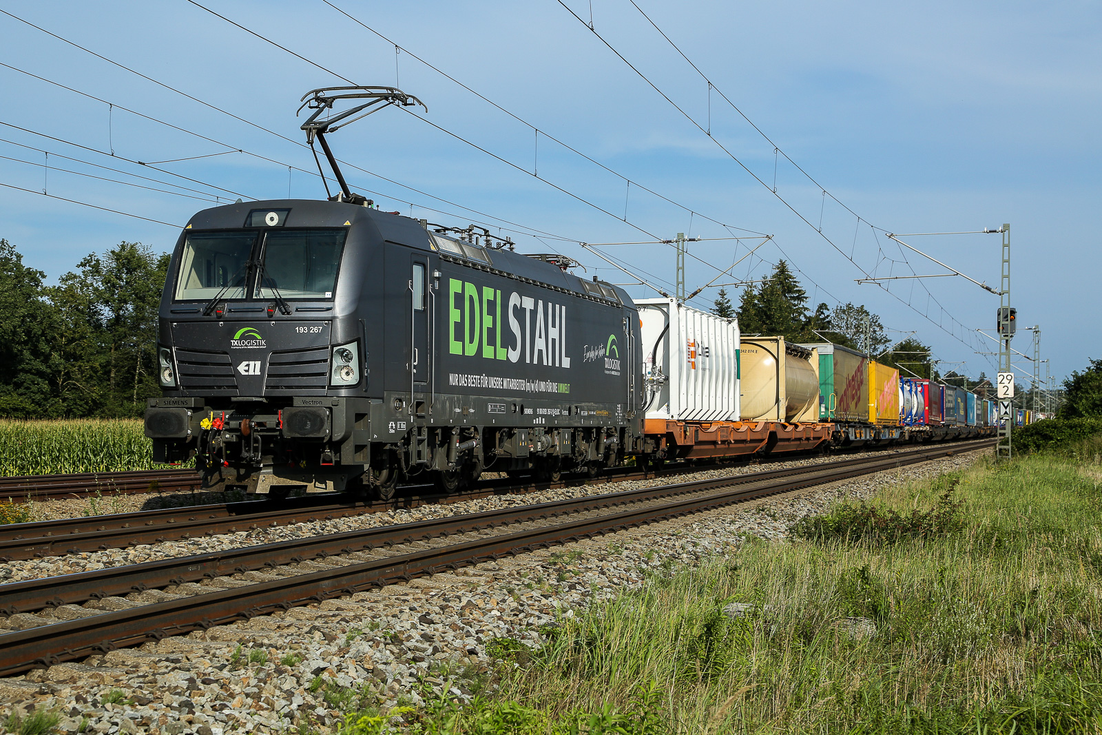 "Edelstahl" (TXL 193 267) rollt hier am 22.08.2024 mit einem Klv-Zug bei Eglharting.