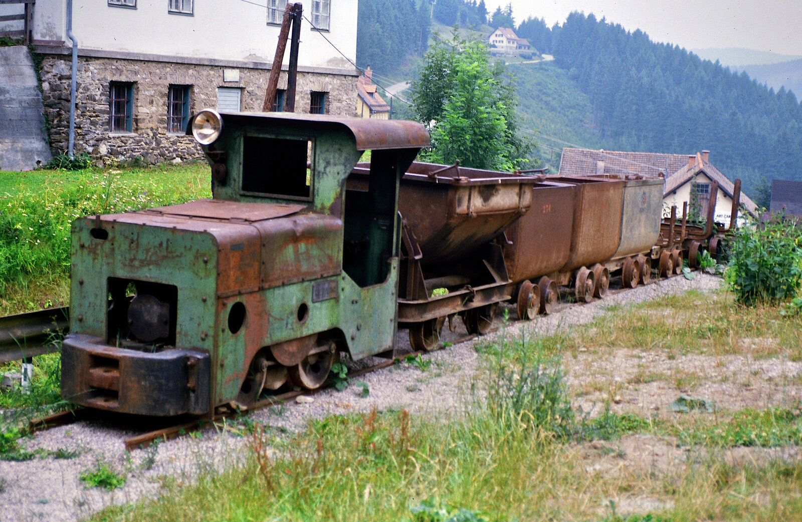 Im Bahnhof Trassdorf steht die 298.51 mit einem schweren Güterzug und wartet an einem warmen Abend im August 1980 auf die Weiterfahrt in Richtung Brunn am Berg.