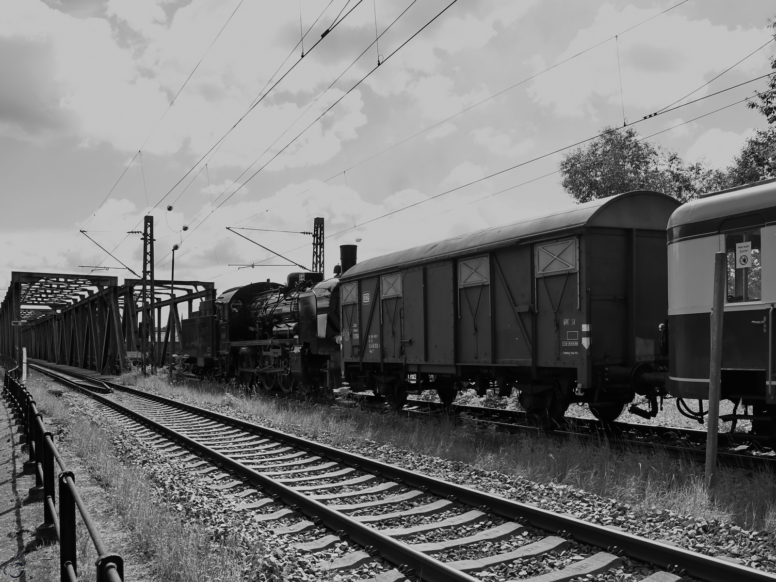 Nachschuss auf den von der Dampflokomotive 38 2267 gezogenen Sonderzug, welcher Anfang Juli 2024 auf der Ruhrtalstrecke unterwegs war und gleich die Eisenbahnbrücke in Hattingen erreicht.