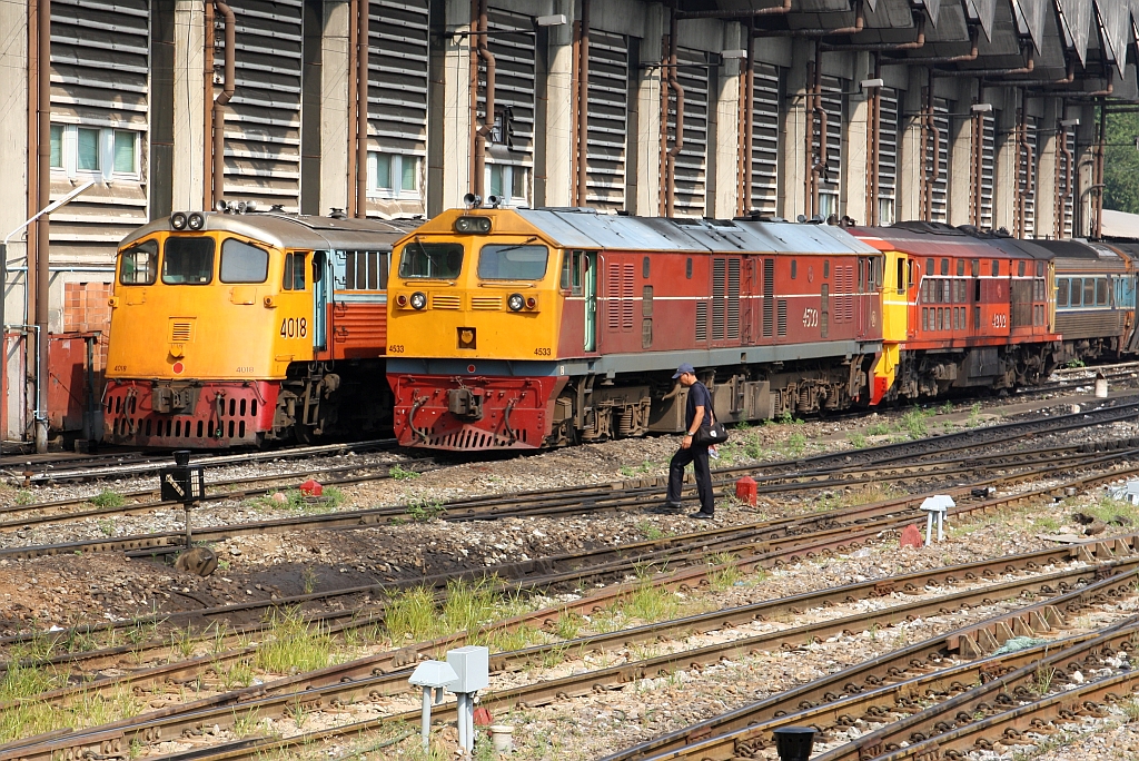 Am 10.Dezember 2023 warten im Depot Hua Lamphong folgend Fahrzeuge den nächsten Einsatz. Von links nach rechts: GEK 4018 (Co'Co', de, General Electric, Bj.1963, Fab.Nr. 34867), GEA 4533 (Co'Co', de, General Electric, Bj.1995) und AHK 4202 (Co'Co', de, Krupp, Bj.1980, Fab.Nr. K-5475).