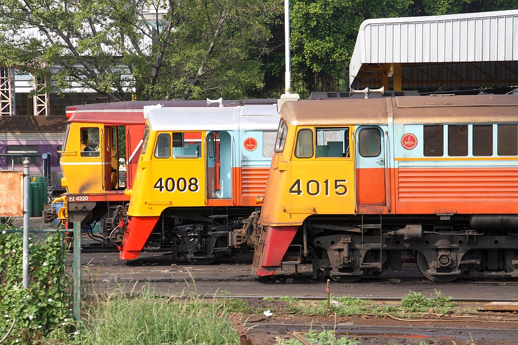 Am 10.Dezember 2023 warten im Depot Hua Lamphong folgend Fahrzeuge den nächsten Einsatz. Von links nach rechts: AHK 4220 (Co'Co', de, Krupp, Bj.1980, Fab.Nr. K-5484), GEK 4008 (Co'Co', de, General Electric, Bj.1963, Fab.Nr. 34857) und GEK 4015 (Co'Co', de, General Electric, Bj.1963, Fab.Nr. 34864).