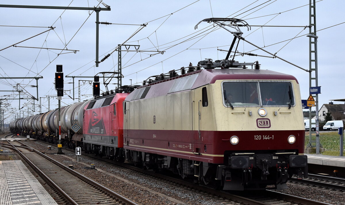 Bahnlogistik24 GmbH, Dresden mit der Doppeltraktion mit der angemieteten SEL Lok "120 144-1" (NVR:"91 80 6120 144-1 D-SEL") + "120 201-9" Name: "Rosi" (NVR:"91 80 6120 201-9 D-BLC") und einem Kesselwagenzug am 31.01.24 Vorbeifahrt Bahnhof Rodleben.