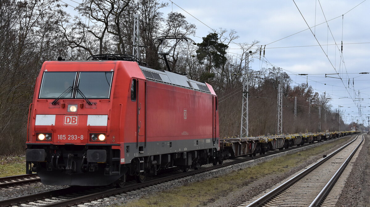 DB Cargo AG, Mainz mit ihrer "185 293-8" (NVR: "91 80 6185 293-8 D-DB") und einem Zug Containertrag- u. Taschenwagen (leer) am 31.01.24 Durchfahrt Bahnhof Königsborn.