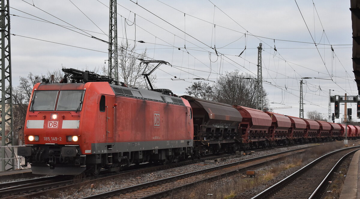 DB Cargo AG, Mainz mit ihrer "185 149-2" (NVR: "91 80 6185 149-2 D-DB") und einem Ganzzug gedeckter Schüttgutwagen am 31.01.24 Vorbeifahrt Bahnhof Magdeburg Neustadt.