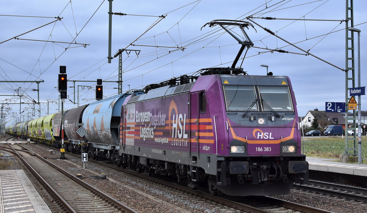 HSL Logistik GmbH, Hamburg [D] mit ihrer Akiem Lok "186 383-6" [NVR-Nummer: 91 80 6186 383-6 D-AKIEM] und einem Getreidezug am 31.01.24 Vorbeifahrt Bahnhof Rodleben.