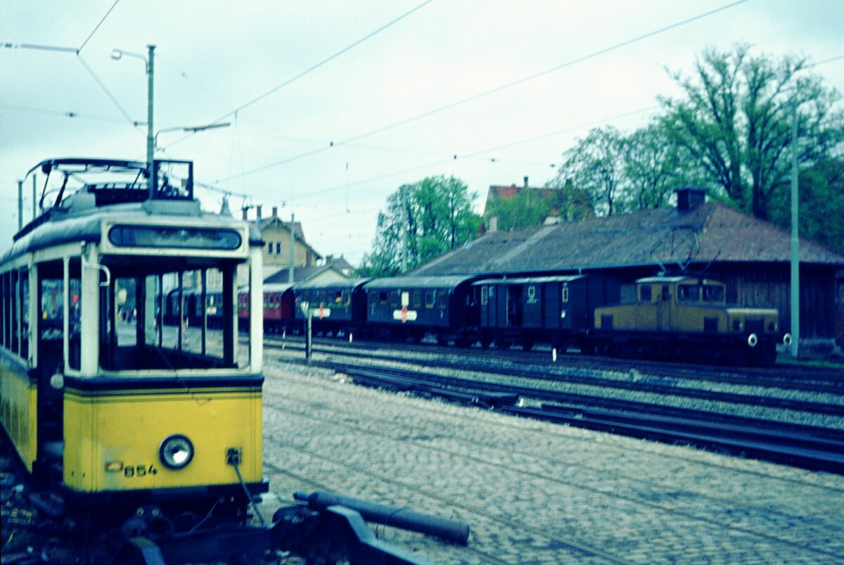 SSB Stuttgart_Filderbahn__Voll elektrisch. GS(Gartenschau-)Tw 854 [Uerdingen, 1939] im Prozess der Verschrottung befindlich... (Diese Tw waren zuvor noch einige Jahre auf der Linie 31 -Filderbahnstrecke S-Vaihingen-PLieningen- eingesetzt) und SSB Güterzug-Ellok Nr.1 [Trelenberg Breslau 1922] rangiert die P-Wagen.__03-05-1975