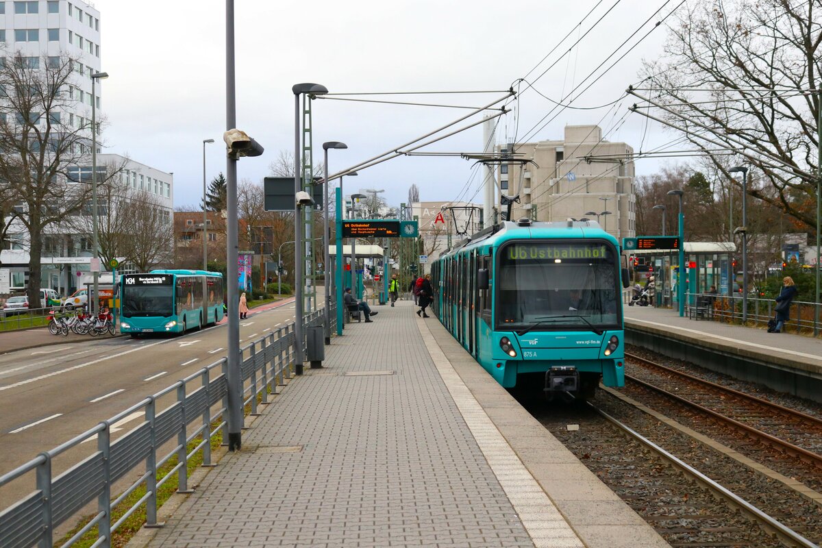VGF Bombardier Flexity Swift U5-50 Wagen 875 am 03.02.24 in Frankfurt Industriehof