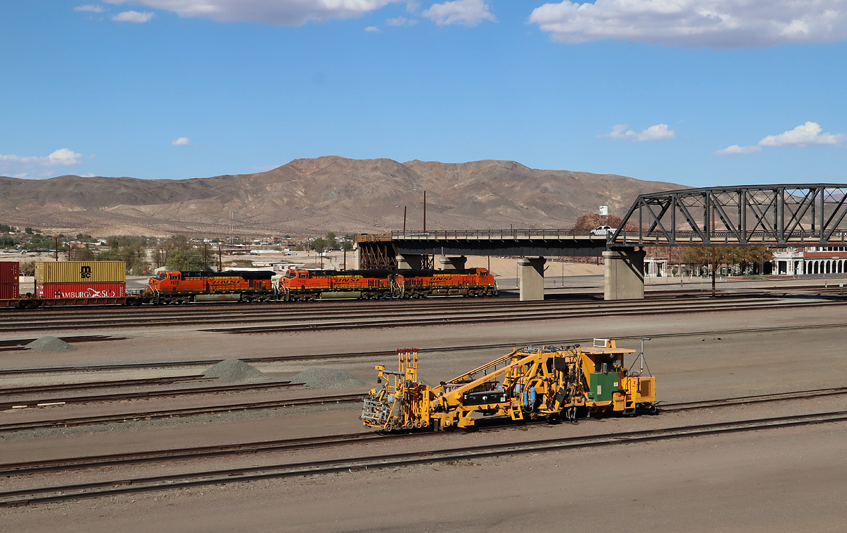 Über diesen Teil des Bahnhofs Barstow führt eine Strassenbrücke, die perfekte Fotostelle: Hier taucht ein Containerzug aus östlicher Richtung auf. Im Hintergrund sieht man einen weiteren Güterzug, der auf die Weiterfahrt wartet. Barstow, CA, 24.9.2022