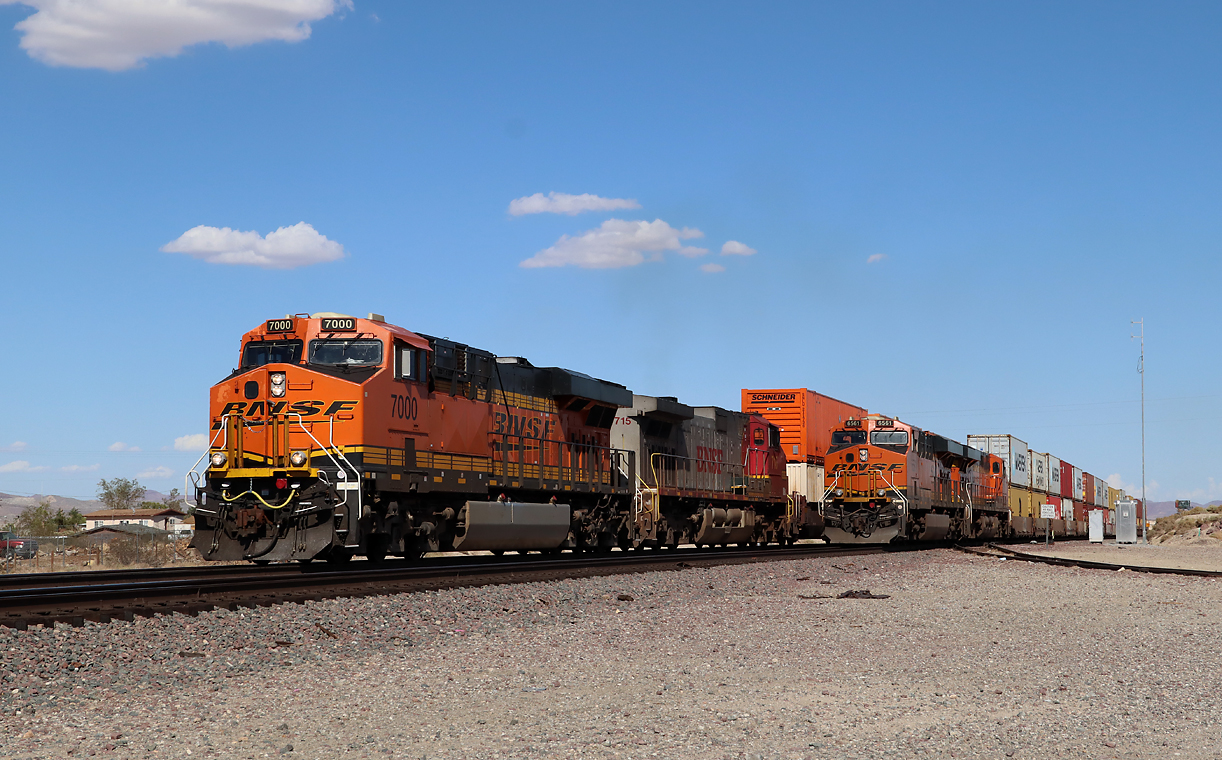 Als Abschluss unserer vier Fototage am Cajon Pass fuhren wir noch einmal auf der Hauptstrasse zur Passhöhe. Diesmal lief an der Spitze eine BNSF-Lok mit Warbonnet-Anstrich. Cajon Pass, CA, 24.9.2022