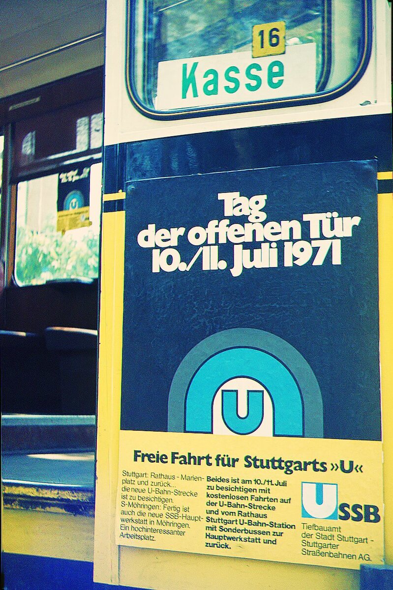 SSB Stuttgart__Erste öffentliche Fahrten auf der "U-Bahn-Strecke" (später "Stadtbahn") 'Marienplatz'-'Rathaus'. Der erste Museumswagen der SSB, Tw 222 von 1904 war auch dabei (als Standwagen).__11-07-1971