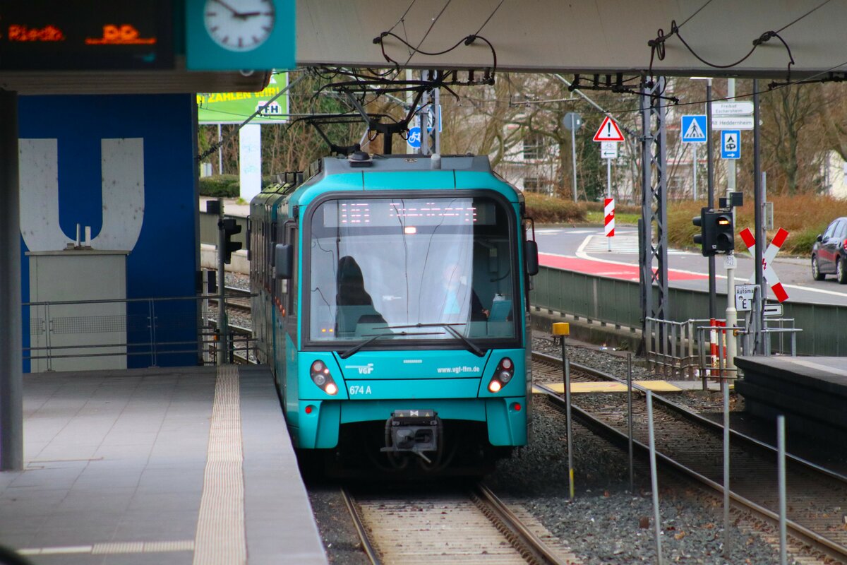 VGF Bombardier Flexity Swift U5-50 Wagen 825 am 03.02.24 in Frankfurt Heddernheim vom Bahnsteig aus fotografiert