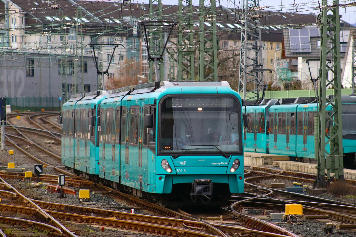VGF Bombardier Flexity Swift U5-25 Wagen 691 am 03.02.24 in Frankfurt Heddernheim vom Bahnsteig aus fotografiert