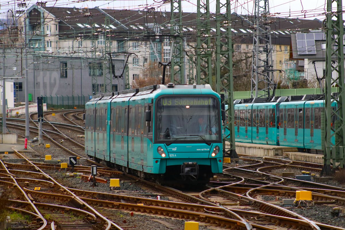 VGF Bombardier Flexity Swift U5-50 Wagen 829 am 03.02.24 in Frankfurt Heddernheim vom Bahnsteig aus fotografiert