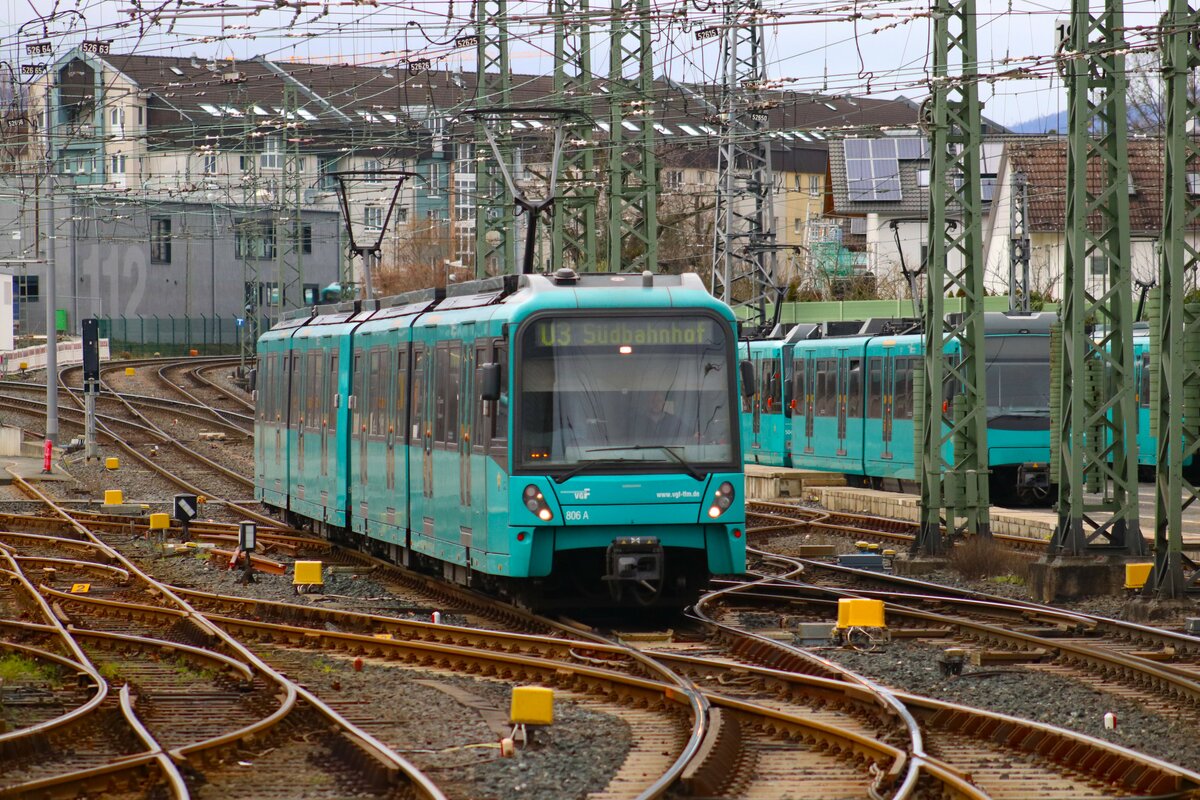VGF Bombardier Flexity Swift U5-50 Wagen 806 am 03.02.24 in Frankfurt Heddernheim vom Bahnsteig aus fotografiert