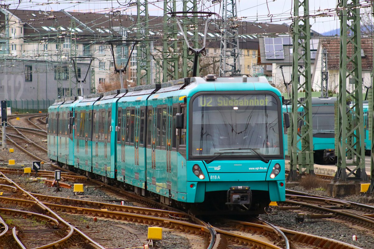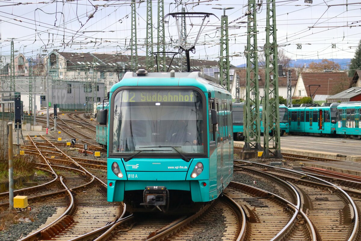 VGF Bombardier Flexity Swift U5-50 Wagen 818 am 03.02.24 in Frankfurt Heddernheim vom Bahnsteig aus fotografiert